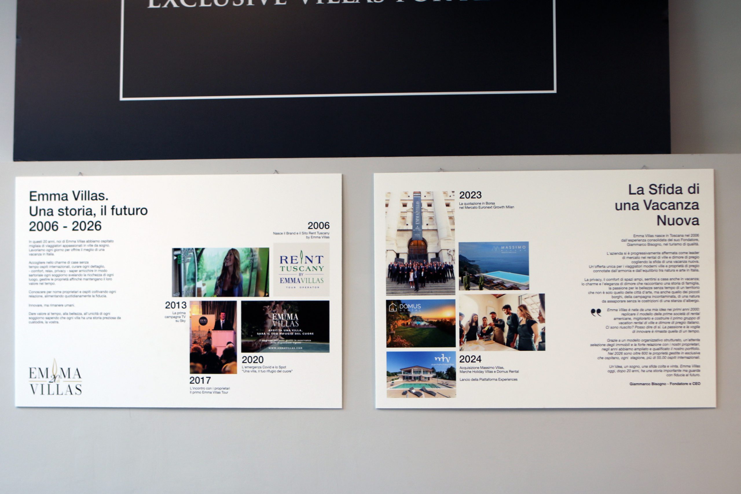 Il progetto espositivo è stato pensato come un percorso visivo attraverso immagini, luoghi e volti che hanno segnato le tappe principali della storia del Gruppo: dalle prime proprietà entrate nel circuito fino allo sviluppo della rete di ville che oggi rappresenta uno dei punti di riferimento nel panorama italiano del vacation rental di alta gamma.
